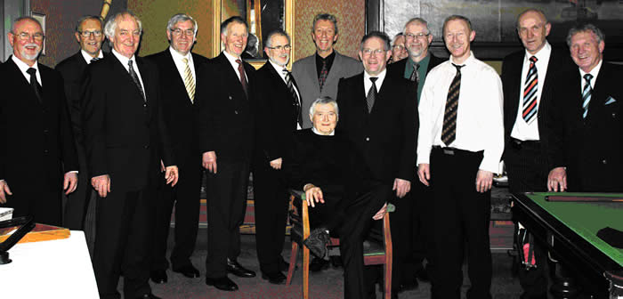 SKUMLE SANGFUGLER: Bergen mannskor er med som statister i den nye Varg Veum-filmen. Her med skuespiller Sigmund Sæverud sittende i midten. |
